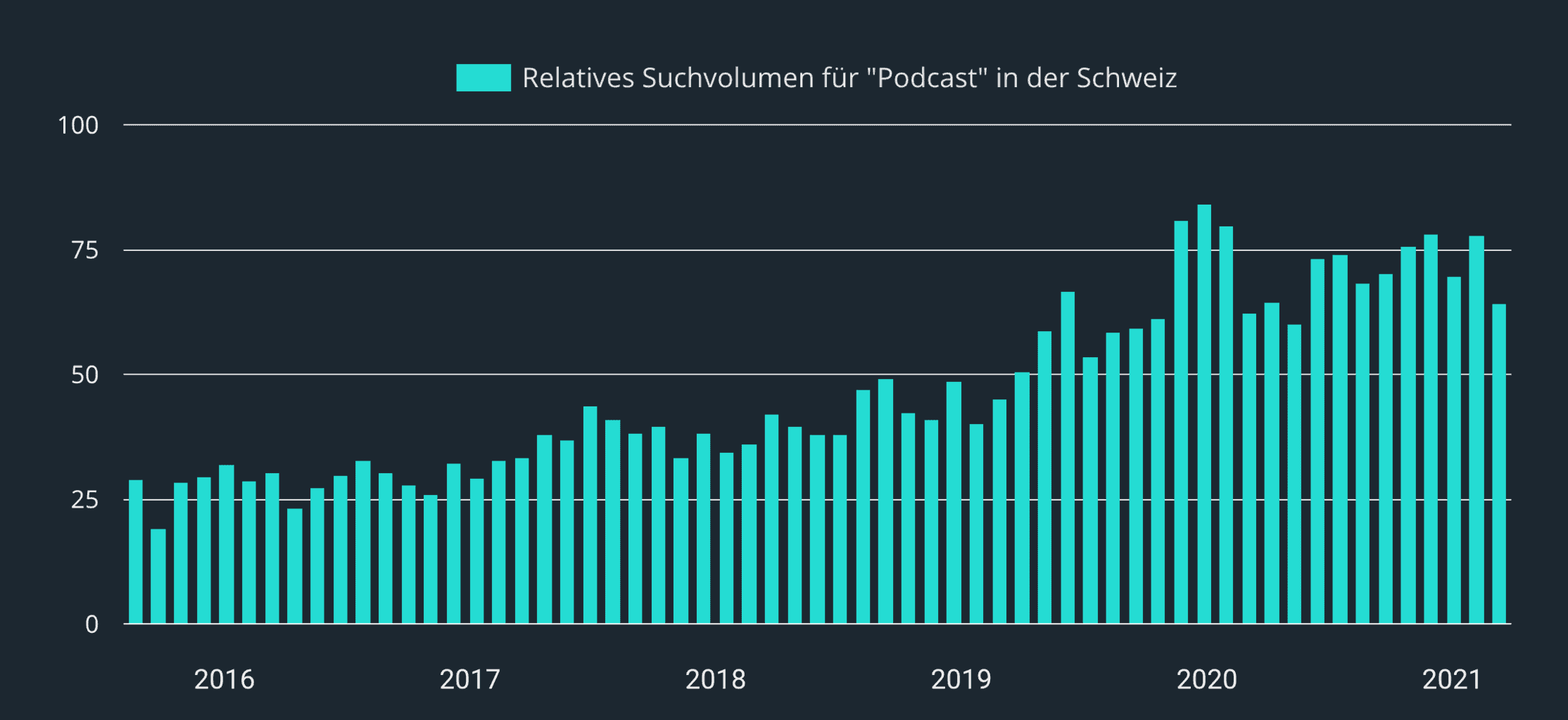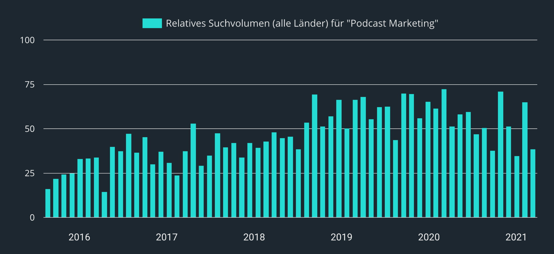 Google Trends bestätigt die weltweit hohe Nachfrage nach Podcast-Marketing, welche sich seit 2016 verdoppelt hat. Seit 2019 befindet sich das Suchvolumen auf einem konstant hohen Niveau.